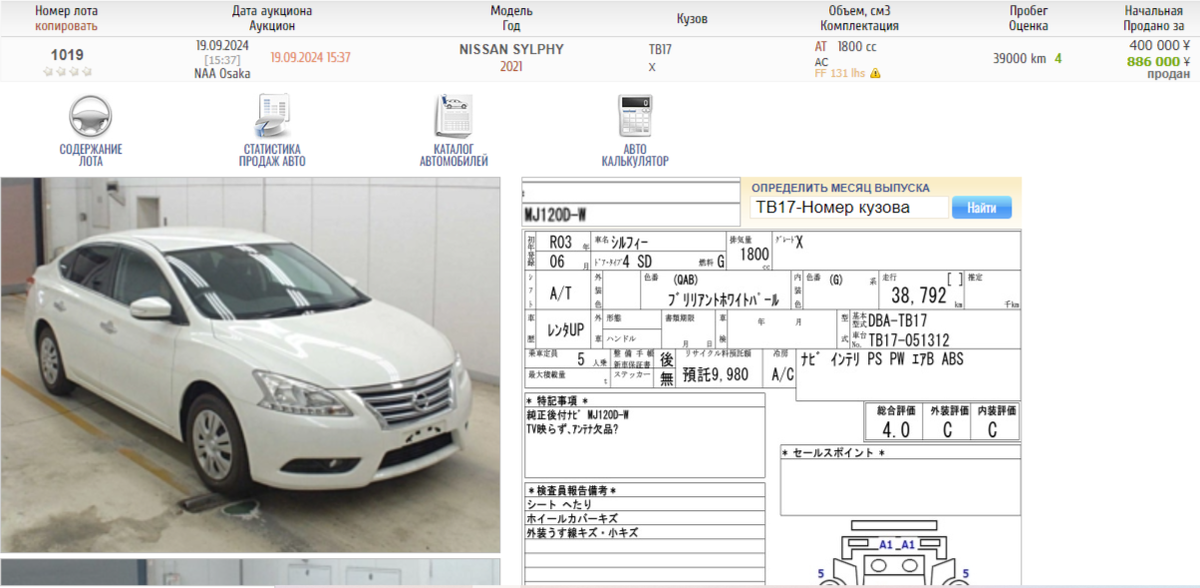 Стоимость седана NISSAN SYLPHY с аукционов Японии.