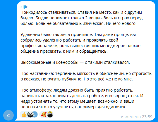 ΠΠΎΠ²ΠΎΡΠΎΡΠ½ΡΠΌ ΠΌΠΎΠΌΠ΅Π½ΡΠΎΠΌ ΡΡΠ°Π» ΡΠ΅ΡΡΠ΅Π·Π½ΡΠΉ ΡΠ°Π·Π³ΠΎΠ²ΠΎΡ Ρ ΡΡΠΊΠΎΠ²ΠΎΠ΄ΠΈΡΠ΅Π»Π΅ΠΌ ΠΎ Π½Π΅ΠΏΡΠΈΠ΅ΠΌΠ»Π΅ΠΌΠΎΠΌ ΠΏΠΎΠ²Π΅Π΄Π΅Π½ΠΈΠΈ. ΠΡΠΎΠ·Π½Π°Π² ΠΏΡΠΎΠ±Π»Π΅ΠΌΡ, Π°Π²ΡΠΎΡ ΡΠ΅ΡΠΈΠ» ΠΈΠ·ΠΌΠ΅Π½ΠΈΡΡΡΡ. ΠΠ½ Π½Π°ΡΠ°Π» ΡΠ°Π±ΠΎΡΠ°ΡΡ Π½Π°Π΄ ΡΠ°Π·Π²ΠΈΡΠΈΠ΅ΠΌ ΡΠΌΠΏΠ°ΡΠΈΠΈ, ΠΏΠ΅ΡΠ΅ΡΠΌΠΎΡΡΠ΅Π» ΡΠ²ΠΎΠΉ ΠΏΠΎΠ΄Ρ ΠΎΠ΄ ΠΊ ΠΌΠ΅Π½ΡΠΎΡΡΡΠ²Ρ ΠΈ ΡΡΠ°Π» ΡΠ΅ΡΠΏΠ΅Π»ΠΈΠ²Π΅Π΅ ΠΊ Π²ΠΎΠΏΡΠΎΡΠ°ΠΌ junior-ΡΠ°Π·ΡΠ°Π±ΠΎΡΡΠΈΠΊΠΎΠ². ΠΠΎΡΡΠ΅ΠΏΠ΅Π½Π½ΠΎ Π΅ΠΌΡ ΡΠ΄Π°Π»ΠΎΡΡ Π½Π°ΠΉΡΠΈ Π±Π°Π»Π°Π½Ρ ΠΌΠ΅ΠΆΠ΄Ρ ΡΠ΅Ρ Π½ΠΈΡΠ΅ΡΠΊΠΎΠΉ ΡΠΊΡΠΏΠ΅ΡΡΠΈΠ·ΠΎΠΉ ΠΈ ΡΠ΅Π»ΠΎΠ²Π΅ΡΠ½ΠΎΡΡΡΡ.