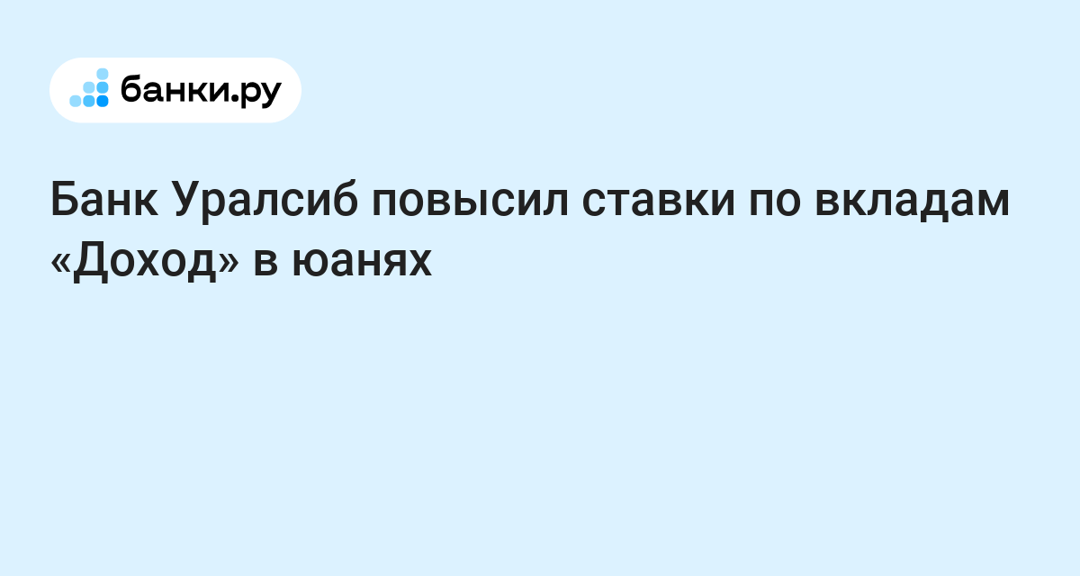 Банк Уралсиб повысил ставки по вкладам вида «Доход» в китайских юанях на большинстве сроков размещения. Теперь ставки по вкладам вида «Доход» в юанях в зависимости от срока, пакета услуг и суммы депозита составляют 5,80–10,30% годовых с учетом ежемесячной капитализации процентов. Вклады вида «Доход» можно открыть в онлайн-банке «Уралсиб Онлайн» или в отделении Уралсиба. Минимальная сумма для открытия вклада — 50 000 юаней. Пополнение и продление, а также расходные операции по вкладу не предусмотрены. Подробную информацию и полные условия по вкладам и накопительным счетам можно получить в ближайших отделениях Уралсиба, по телефону: 8-800-250-57-57 (звонок по России бесплатный) или на сайте ПАО «БАНК УРАЛСИБ».