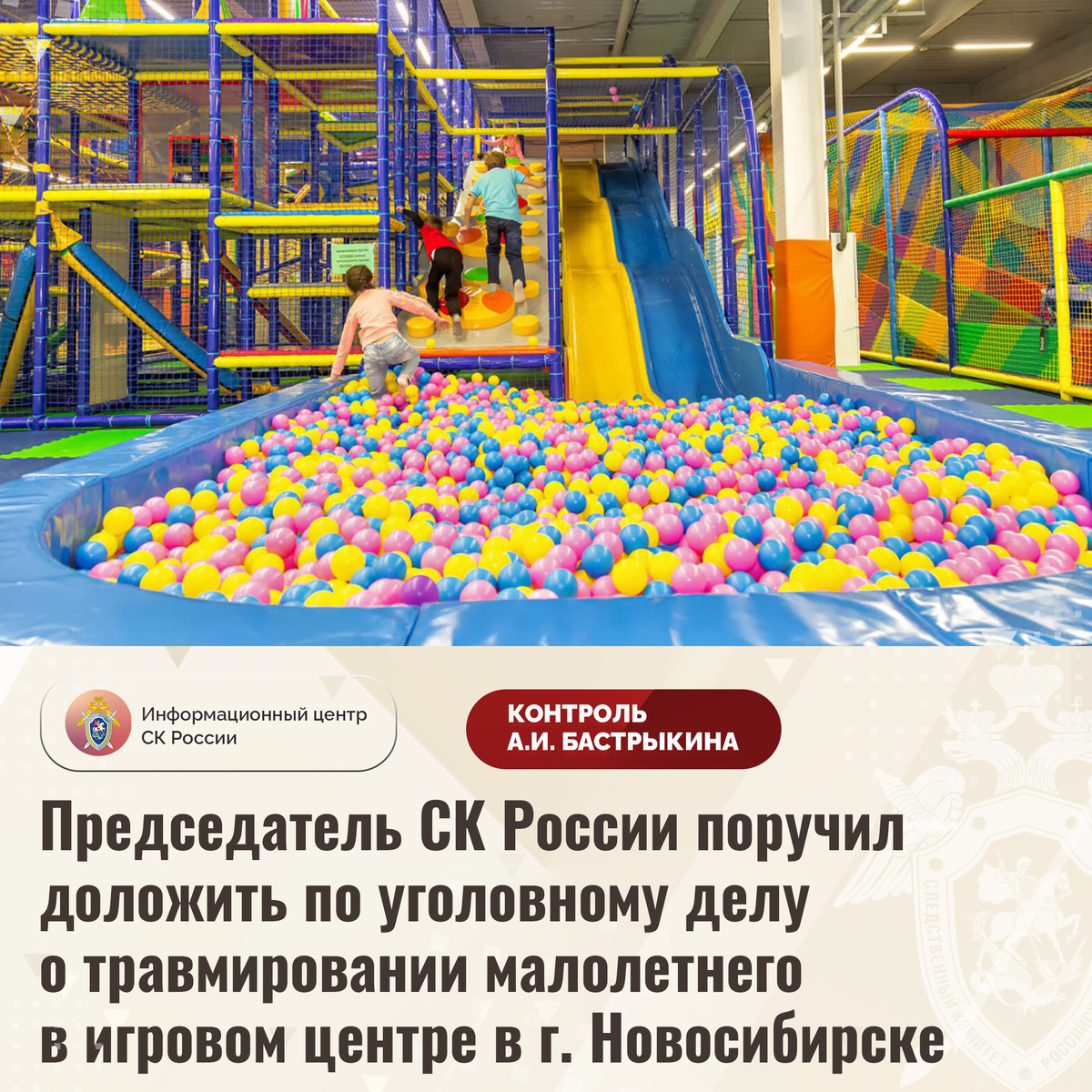Председатель СК России поручил доложить по уголовному делу о травмировании малолетнего в игровом центре в г. Новосибирске В сети Интернет сообщается, что в августе текущего года в одном из игровых центров в городе Новосибирске шестилетний мальчик упал в сухой бассейн с кубиками и получил травму позвоночника. Мать потерпевшего выражает несогласие с ходом установления обстоятельств его травмирования и высказывает предположение, что инцидент произошел по вине сотрудников учреждения, не обеспечивших безопасность пребывания малолетнего в игровой зоне. В СУ СК России по Новосибирской области по данному факту возбуждено уголовное дело. Председатель Следственного комитета Российской Федерации Александр Иванович Бастрыкин поручил руководителю СУ СК России по Новосибирской области Евгению Геннадьевичу Долгалеву представить доклад об установленных в ходе проведенных следственных действий обстоятельствах, а по завершении расследования – о его результатах. Исполнение поручения поставлено на контрол