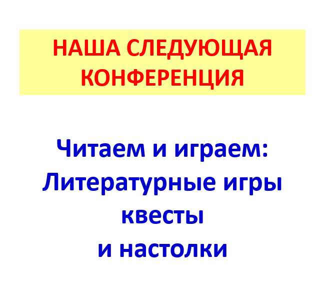 Дорогие друзья и коллеги, тема нашей следующей конференции: читаем и играем! Дата проведения мероприятия: декабрь 2024 г. Какой станет эта конференция? Зависит от вас 🤗 Здесь можно поговорить о литературных играх и книжных квестах, настолках. Может быть поговорим и о театральных постановках? :) В любом случае, все наши конференции строятся на основе ваших пожеланий и запросов! Пожалуйста, напишите в форме предварительной регистрации https://forms.yandex.ru/u/672098d9d04688757c8bb277/