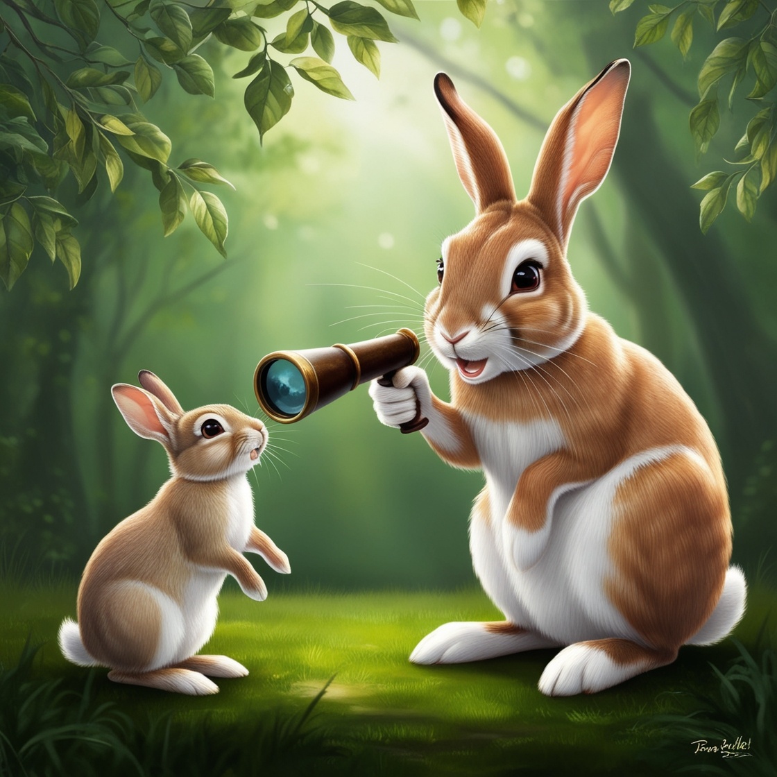 В самом обычном Волшебном Лесу жил кролик по имени Кувырок. Он не искал приключений, они находили его сами. Однажды его, гуляющего среди деревьев, внимание привлекло что-то блестящее между корнями большого дерева. Подойдя ближе, он обнаружил подзорную трубу!