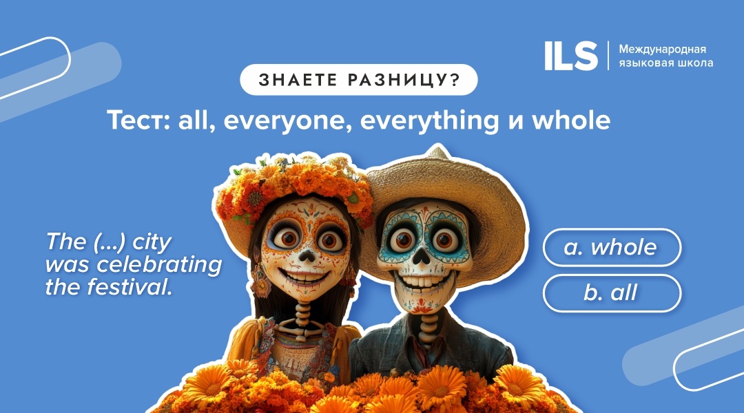 Вы знаете как правильно использовать такие слова, как "all", "everyone", "everything" и "whole"? Это может показаться не так уж и сложно, но иногда можно запутаться можно. В этом тесте мы проверим ваше понимание этих слов. Готовы? Хэллоуин прошёл, а наше предложение всё ещё в силе. До 15 ноября вы можете записаться на курс “Английский – это не страшно” и пройти его бесплатно. Курс длится неделю, за которую в чат-боте Telegram вы разберёте основные темы, которые вызывают страх у изучающих английский в грамматике, лексике и произношении.
