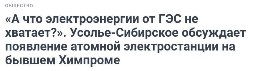 В сети стали распространяться слухи о возведении в городе Усолье-Сибирское в Иркутской области атомной электростанции на территории бывшего «Химпрома». В частности, в СМИ появились статьи с подобными «кричащими» заголовками и хронологией общественных обсуждений.