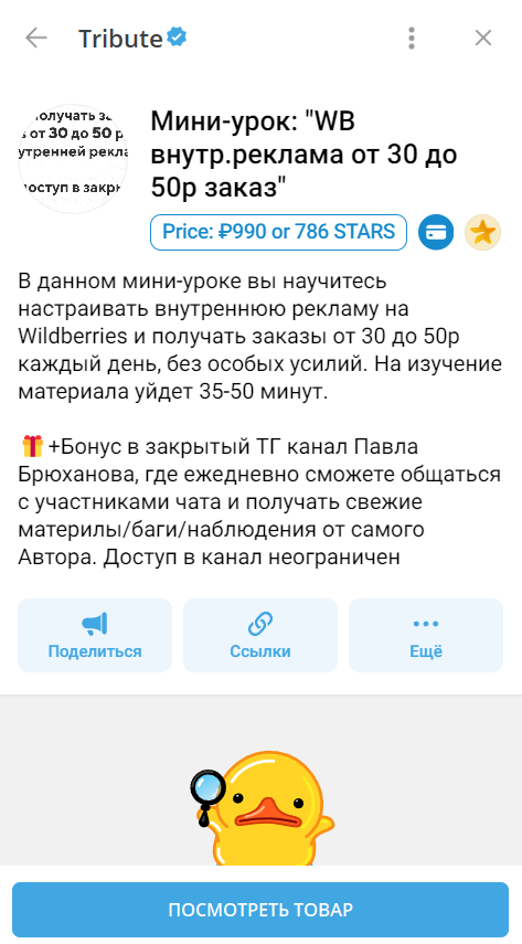 Не скам, не нутра и прочие странные сложа пришедшие к нам из арбитража. Простой оффер по внутренней рекламе Вайлдберриз. Автор делиться своей методичкой за 990р в которой предлагает авторские методики продвижения товара на ВБ (см.скрин выше) От каждой покупки автор делится 50% вознаграждения (см.скрин) Все платежи проходят чере Tribute официальный сервис от Телеграмм. Поэтому проблем с выплатами не будет, все платежи (вознаграждения) придут в течение 5 минут. Источники привлечения трафика выбирает каждый сам для себя - основной шаг влияющий на выплату это покупка материала. Вот примеры сайта, который в данный момент генерируют основной поток трафика для автора, можете скопировать его и применить в своем Яндекс.Директе или ином инструменте таргета: