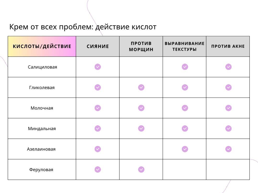 Кислоты в уходе "шлифуют" кожу, избавляя от шелушений, неровностей, пигментации, и стимулируют обновление.