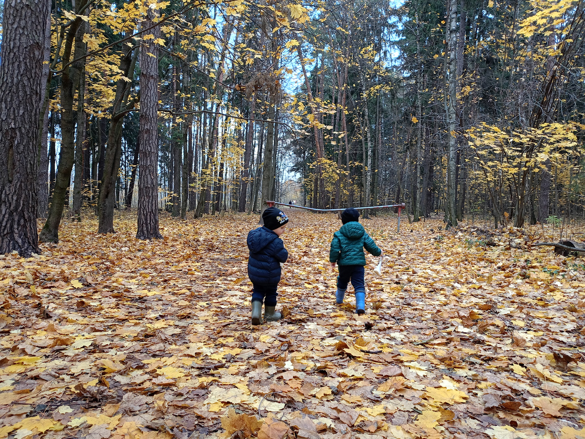 Ровно год назад я писала статью о том, как впервые одна выгуляла в лесу двойняшек. Уже снежок лежал😄 Тогда, помнится мне, прогулки на площадке были все ещё кошмаром, а в лесу было спокойно, катятся себе колобки, да катятся по тропинке. И вот в воскресенье решила я повторить сей подвиг. Думаю: ну постарше уже, сделаем ка мы большой круг по нашему лесу. По «большому» кругу мы гуляли в карантин, когда все сидели взаперти. Наш лес нас тогда очень выручал. Мотивируя наш поход кормлением птиц, удалось быстро собраться. Каждому был вручен пакет с пшеном. Прихватили с собой Матвейку, который неделю сидел на больничном и сам Бог велел ему проветриться. В лесу очерь красиво. Кормушки у нас неподалёку от входа, а лес, напомню, прямо у дома. Не успели в лес зайти, как Леон завис у припаркованного мотоцикла. Пришлось силком тащить его. На фото уже бодрячком бежит. Попросила Марселя сфотографироваться. Тот встал в позу. Я так и не поняла где он это видел и что означает эта комбинация из пальц
