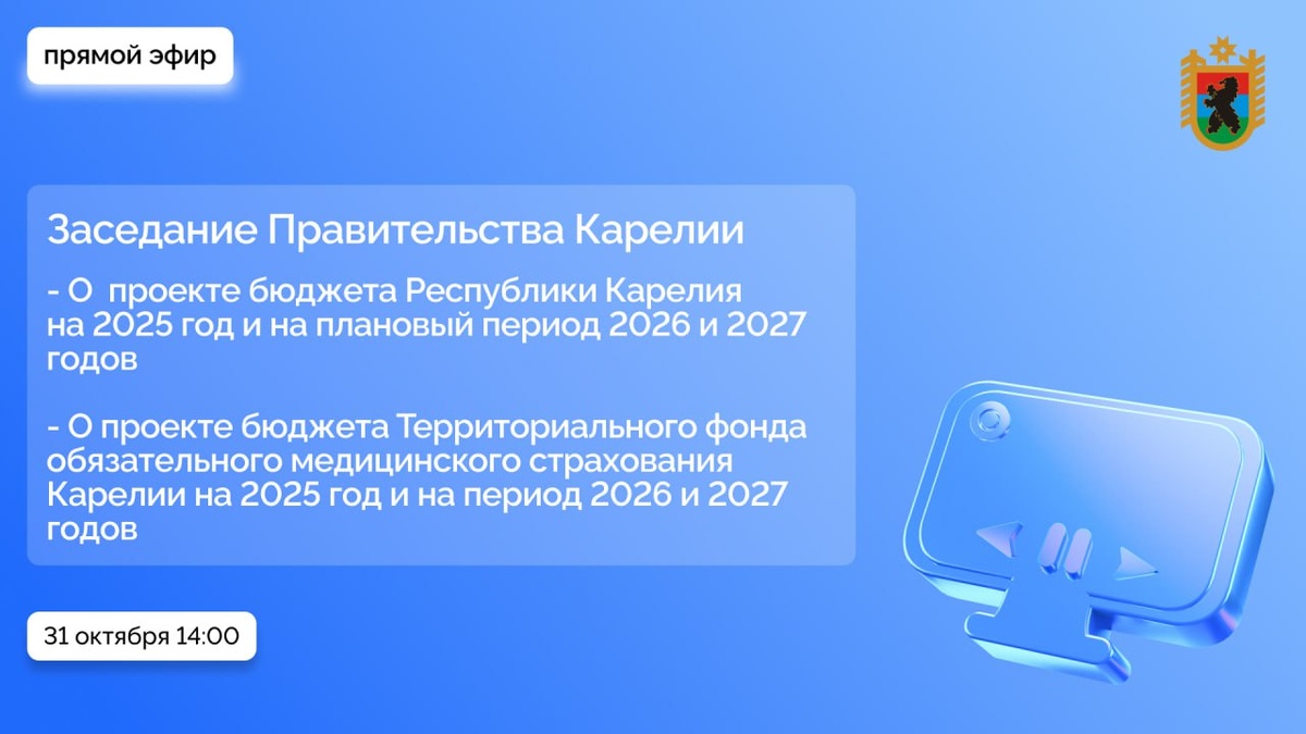 Заседание в формате видеоконференцсвязи начнется в 14:00. Посмотреть его можно будет в прямом эфире. 31 октября под руководством Главы Карелии Артура Парфенчикова состоится заседание Правительства республики. Первым вопросом участники обсудят: - проект бюджета региона и его основные характеристики на 2025 год и на плановый период 2026 и 2027 годов; - основные направления государственной долговой политики республики на 2025 год и на плановый период 2026 и 2027 годов. С докладом выступит и.о. министра финансов Карелии Александр Климочкин. Вторым вопросом заседания станет проект бюджета Территориального фонда обязательного медицинского страхования на 2025 год и на плановый период 2026 и 2027 годов. О нем доложит министр здравоохранения республики Михаил Охлопков. Заседание пройдет в формате видеоконференцсвязи. Трансляция доступна по ссылке. Начало – в 14.00. фото: © Управление пресс-службы правительства