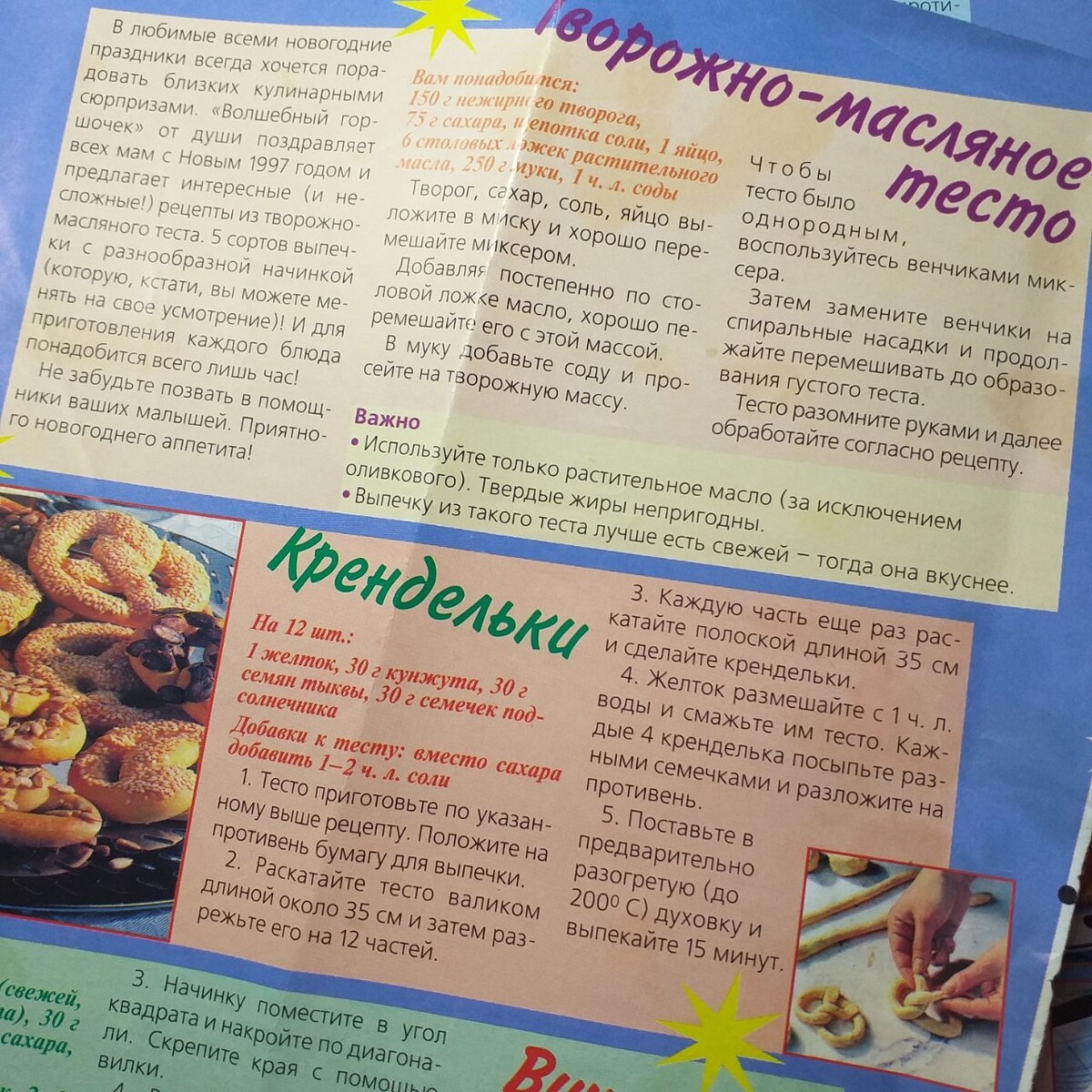 У меня даже сохранилась вырезка. Так как тесто вкусное само по себе, для выпечки не нужна какая-то особая начинка. Особенность того теста, что оно не просто творожное, а творожно - масляное. Сейчас я предпочитаю готовить из менее калорийного, обычного, но такого же вкусного творожного теста. Наличие в нем белка и кальция греет душу. Полезный десерт - что может быть приятней?