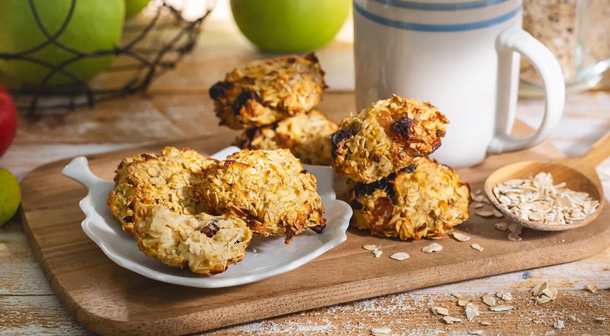 Овсяное печенье для правильного питания - популярное угощение среди сторонников здорового образа жизни. Промойте изюм и уберите веточки, если они есть. Залейте ягоды горячей водой и оставьте на 15 минут, пока будете готовить другие ингредиенты. Очистите яблоки от кожуры, удалите сердцевину и порежьте их дольками. Измельчите в блендере или натрите на средней терке. Разбейте яйцо в глубокую миску и хорошо взбейте его венчиком. Добавьте овсяные хлопья, измельченные яблоки и размягченный изюм. Перемешайте массу и дайте постоять 10-15 минут, чтобы хлопья набухли. Подготовьте противень, застелив его пергаментной бумагой и смазав маслом с помощью кулинарной кисточки. Мокрыми руками сформируйте из массы небольшие шарики, слегка прижмите их и выложите на противень. Поместите противень с заготовками в духовку, разогретую до 180 градусов. Выпекайте овсяное печенье примерно 20 минут, ориентируясь на свою духовку. Готовое печенье переложите на тарелку, накройте тканевой салфеткой и дайте остыть. По
