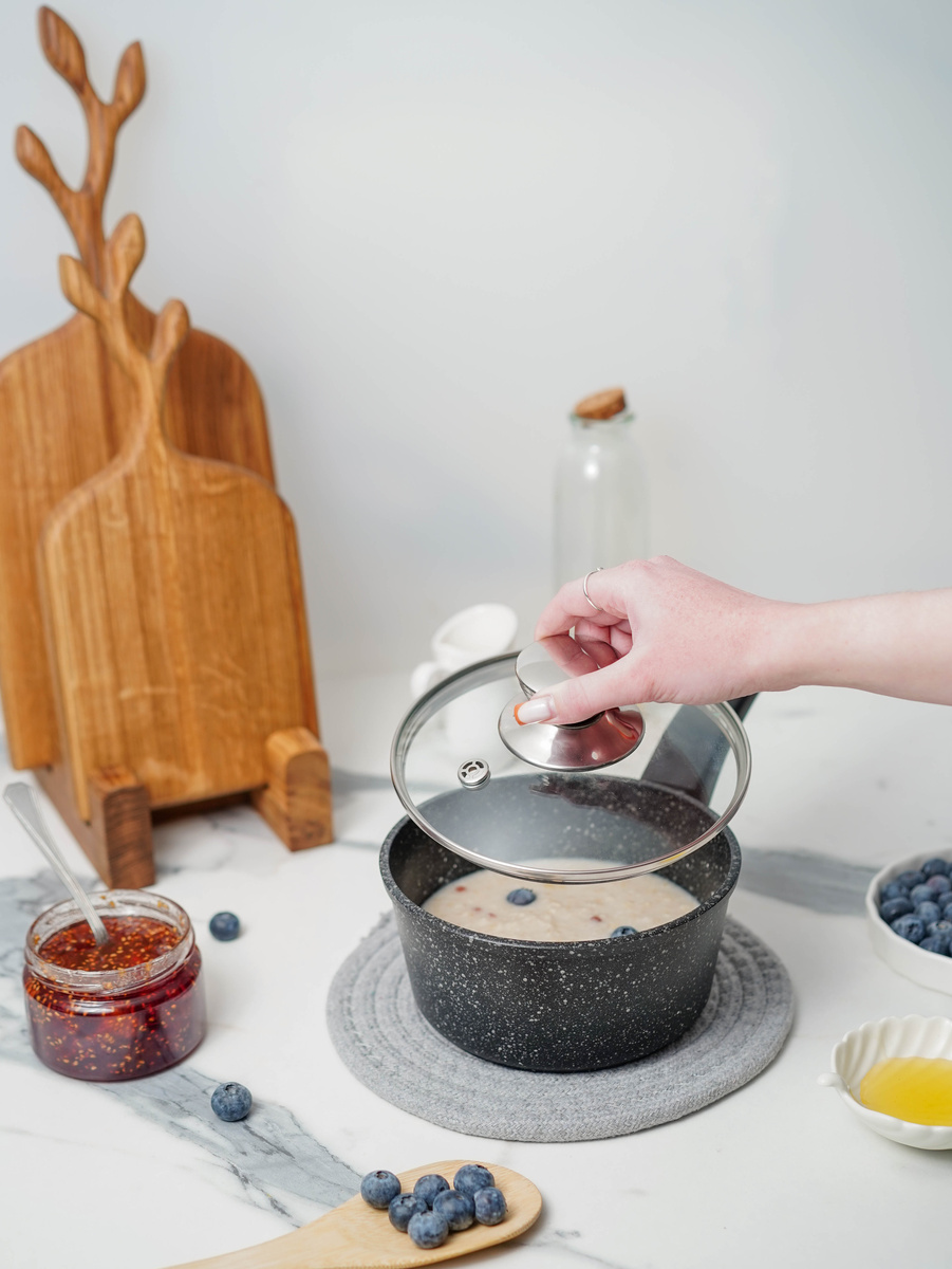 В ковш для каши необходимо добавить нужное количество воды или молока, в зависимости от рецепта, довести до кипения, уменьшить огонь и варить до готовности, периодически помешивая. Антипригарное покрытие поможет предотвратить прилипание каши к дну и упростит последующую уборку.