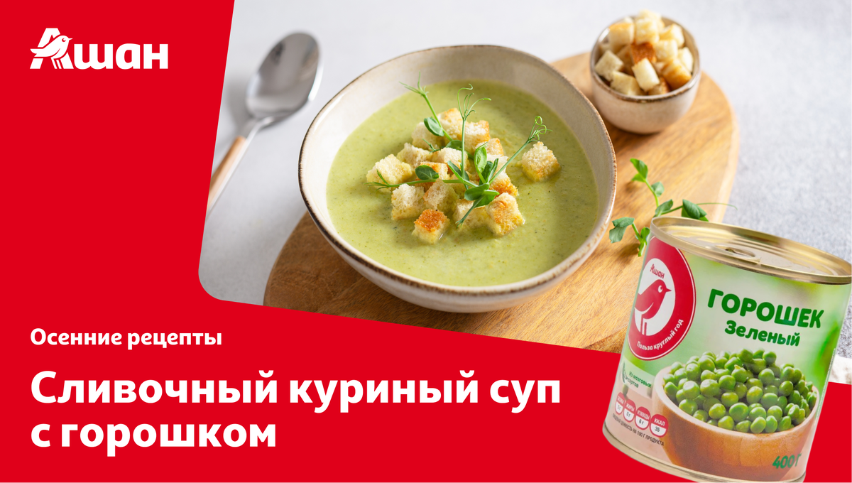 Что может быть приятнее в прохладный день, чем вернуться домой и согреться тарелкой горячего супа? Особенно если это нежный крем-суп с горошком, сливками и ароматными специями. Готовим! Время приготовления: 30 минут Количество порций: 3 Пищевая ценность (на 100 г): 53 ккал Куриный бульон — 800 мл Зелёный горошек (консервированный) — 200 г Цветная капуста — 300 г Картофель — 200 г Морковь — 1 шт. Лук — 1 шт. Сливки 20% — 150 мл Масло растительное — 1 ст. л. Укроп — 40–50 г Чеснок — 1 зубчик Соль, перец — по вкусу Подготовьте овощи: картофель нарежьте кубиками, цветную капусту разберите на соцветия, морковь натрите на тёрке, луковицу мелко порубите. Налейте в кастрюлю растительное масло и слегка поджарьте лук и морковь до румяности. Залейте бульон, добавьте картофель и варите в течение 5 минут после закипания. Добавьте соцветия цветной капусты, а спустя 10 минут — горошек. Потомите суп ещё 3–4 минуты, добавьте чеснок, укроп, сливки, специи. Оставьте на 15–20 минут в тёплом месте. Подавай