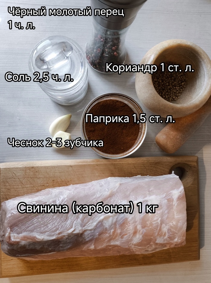 Проголодался. Открываешь холодильник. Берёшь оттуда колбасу и нарезаешь аппетитные кусочки на ломтик хлеба. Одним словом - красота, за исключением некоторых НО. 1) Сколько сейчас стоит более-менее неплохая колбаса за 1 кг? Не менее 700 рублей. Цена карбонада - около 350р за кг. 2) Почему колбаса вечно пересолена? Сырокопченая так точно. 3) Да и в целом, какой процент мяса в ней содержится? Не так давно я начал заменять колбасу вот таким мясом, приготовленным в духовке. Времени требует не много, а результат очень даже неплохой. Ингредиенты: Карбонад зачищаю от жира и т.п., оставляя цельный ровный кусок, массой +/- 1 кг. Я как-то пробовал перед запеканием сверху поджарить мясо, для придания аппетитной корочки. Но по сути, это плюс грязная сковорода и потраченное время, зачем оно нам надо? Ещё один вариант - это цельный кусок проткнуть ножом в нескольких местах и набить специй внутрь. При таком способе запекания, мне кажется, мясо сохраняет больше сочности. Ещё как-то запекал два часа на