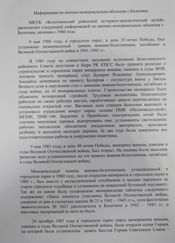 Информация по военно-мемориальным объектам г.Болотное МКУК «Болотнинский районный историко-краеведческий музей» располагает следующей информацией по военно-мемориальным объектам г. Болотное, начиная с 1980 года. 9 мая 1980 года , в Болотном, в городском парке, в день 35-летия Победы, был установлен мемориальный камень воинам-болотнинцам, погибшим в Великой Отечественной войне в 1941-1945 гг. В 1983 году на совместном заседании исполкома Болотнинского районного Совета депутатов и бюро РК КПСС было принято решение о строительстве в городском парке мемориала воинам, павшим в годы ВОВ. Автором проекта мемориала стал Букарев Владимир Александрович. Ансамбль мемориала по проекту Букарева – скульптура воина у звезды Вечного огня в окружении стел с именами воинов-болотнинцев, погибших в годы войны, на 14 мемориальных плитах. Строительство мемориала было объявлено всенародной стройкой. Трудовые коллективы безвозмездно работали на своих рабочих местах, заработанные деньги перечислялись на специ