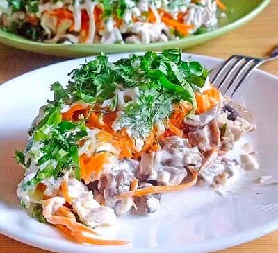 Вкус этого салата приводит в настоящий восторг. Действительно, этот салат оправдывает свое название. Вкуснейшее сочетание жареных с луком шампиньонов с отварной курицей, а морковка по-корейски придает ему остроты и выразительности. Салат как для праздника, так и для скучных будней. Обязательно попробуйте приготовить. Вот рецепт салата с шампиньонами. Продукты необходимые для приготовления: