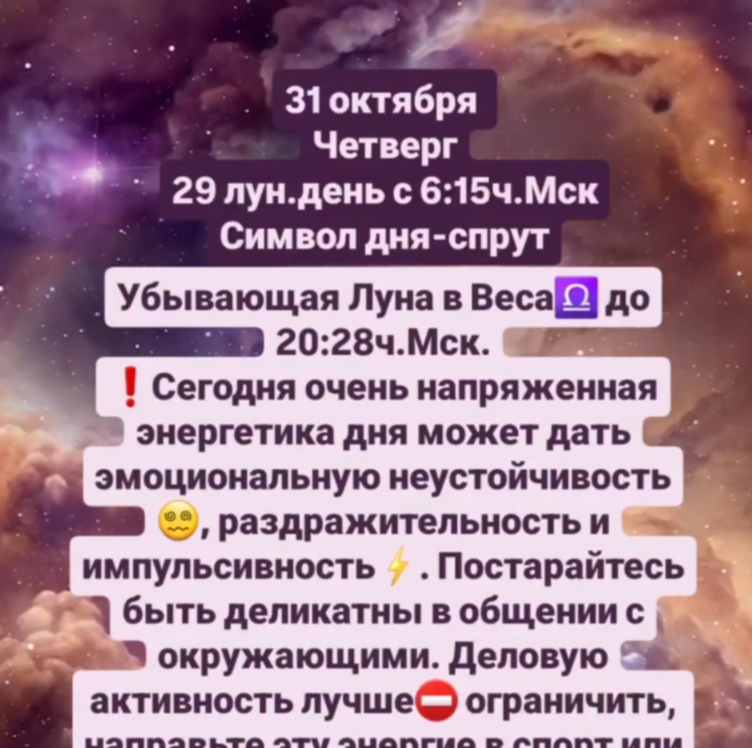 Убывающая Луна в Веса♎️ до 20:28ч.Мск. ❗️Сегодня очень напряженная энергетика дня может дать эмоциональную неустойчивость😵💫, раздражительность и импульсивность⚡️. Постарайтесь быть деликатны в общении с окружающими. Деловую активность лучше⛔️ ограничить, направьте эту энергие в спорт или активную деятельность🔥. ⚠️Но соблюдайте осторожность при использовании инструментов, механизмов и острых предметов. В этот лун.день хорошо избавляться от ненужного 💯 Сны- предупреждают,а сбудется ли он зависит от вас ⛔️Стрижка ⛔️ покупки #гороскоп #астрология #луна #астрологияонлайн #астропрогноз #овен #телец #близнецы #рак #лев #дева #весы #скорпион #стрелец #козерог #водолей #рыбы #затмениесолнца #солнечноезатмение #затмение #новолуниевблизнецах #загадываемжелания #загадайжелание #желание #Венера #мечтысбываются #полнолуние
