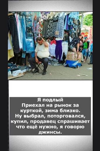 А на выходе встретил продавца курток, он меня спросил купил ли я джинсы у его друга, я сказал купил, отличные джинсы твой друг мне нашёл, и всего за семь тысяч!