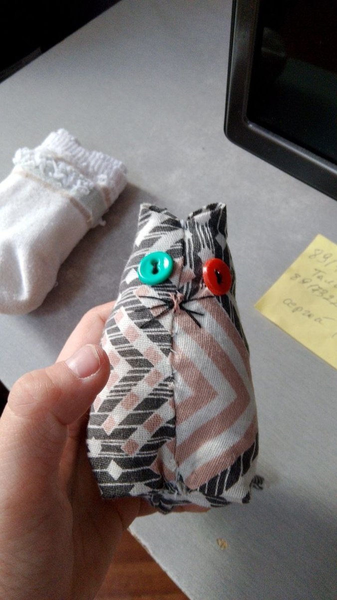 Наш Герой грустит. За окном слякотная осень, никуда идти не нужно — каникулы, остается только скучать и ждать... И, когда из всех родных и близких остался всего-навсего кот, душа рвется к нему, теплому пушистому комочку. Герой юноша находчивый, взял да и сшил своего Пушика. Я, зная оригинал лучше всех, авторитетно заявляю: тряпичный как две капли воды похож на того, кто свернулся клубочком возле меня. Ну а то, что глаза разного цвета, так это у многих котов в породе прописано, значит, что? Правильно, наш Пуша Фифочкин породистый кот 👍