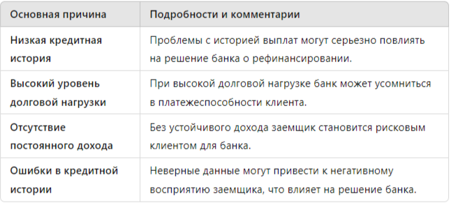 Автор: Фаиль Габбасов — юрист по решению проблем с кредитной историей, банками и БКИ, с опытом работы с 2015 года Введение Рефинансирование кредита — популярный способ для заемщиков улучшить свои условия выплат, уменьшив ставку или снизив ежемесячные платежи. Однако многие клиенты сталкиваются с отказом в рефинансировании, особенно в случае с крупными банками, такими как Сбербанк. В этой статье разберем основные причины отказа, возможные способы решения проблемы и роль исправления кредитной истории. Причины отказа в рефинансировании Сбербанком На практике причины отказов варьируются, и рассмотрение каждого случая может быть уникальным. Тем не менее, основные причины отказа можно выделить в несколько категорий. Нередко причиной отказа становится плохая кредитная история. Важно помнить, что банки принимают во внимание репутацию заемщика, а также наличие или отсутствие просрочек, количество действующих кредитов и текущую долговую нагрузку. Если кредитная история клиента испорчена, вероят