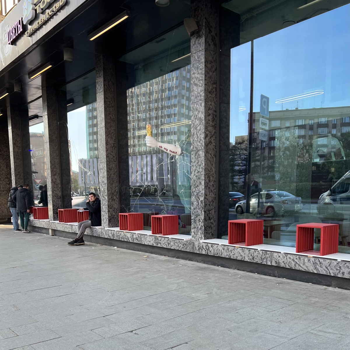 Эта история началась с руки – руки Посейдона, которая торчала из большого витринного окна на Смоленке. А появилась она там, потому что на месте унылого Black Star Burger энтузиасты-кулинары запустили свой новый проект под названием Oh My Toast! Внутри на тот момент еще шел ремонт, и я подметил, что решение с рукой было, скажем так, не самым мудрым. Создатели похихикали и продолжили. Рука на какое-то время исчезла, и я подумал – «о, прислушались к здравой мысли», но нет: спустя пару месяцев рука вернулась, да еще и с золотой шаурмой и надписью в стиле татуировки. Окна менять не стали, оно и понятно – дорого, просто зарисовали трещины краской, типа «арт-объект». Что ж, объект так объект.