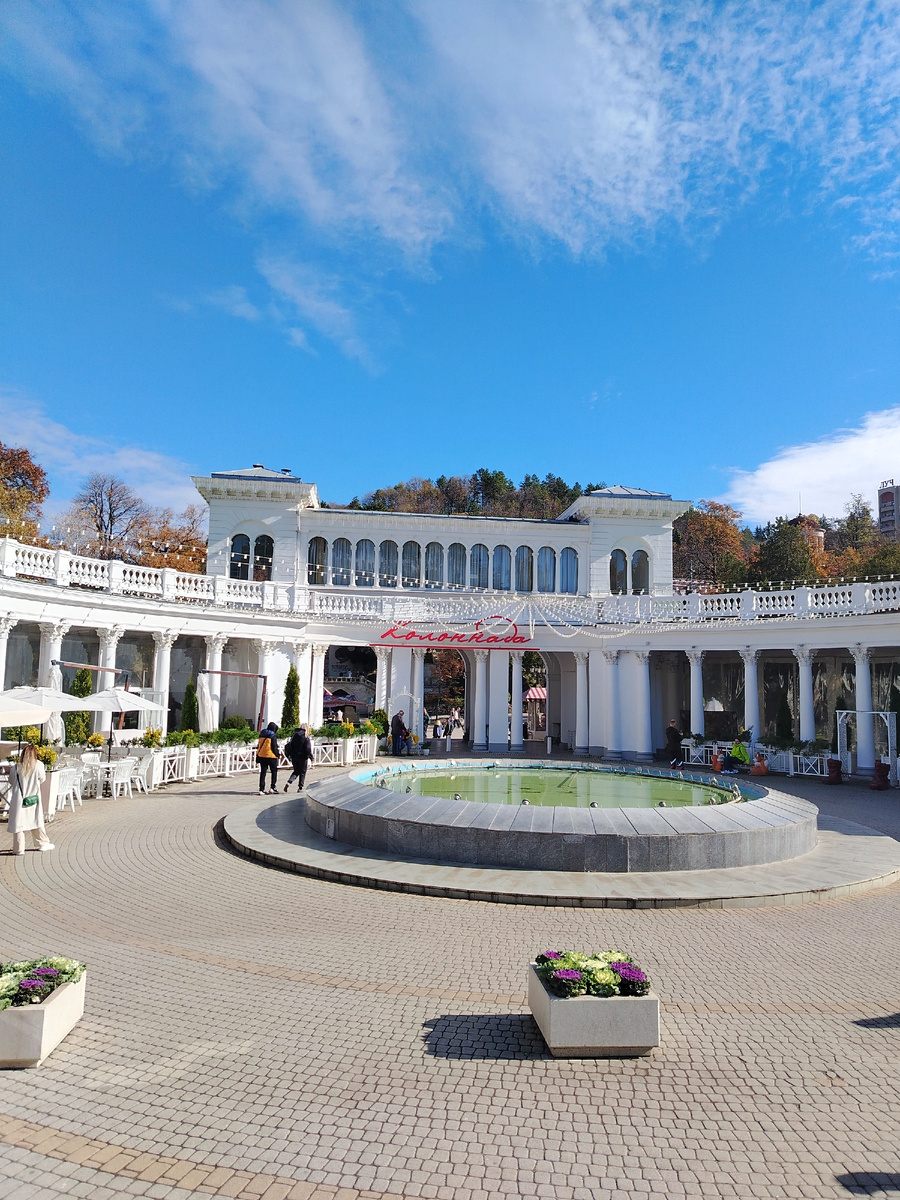 В Кисловодске мы любим ходить на Центральный рынок. Он очень большой, выбор продуктов и не только их хороший, цены умеренные и уже есть "свои" продавцы, к кому ходим регулярно. Правда, идти до него минут 40, хотя можно и доехать. Но мы компанией ходили пешком. Есть в Кисловодске, практически в центре города, другой рынок. Называется он "Кисловодская ярмарка". Про него и расскажу сегодня. Идти до него от Курортного парка максимум 15 минут, и то, если очень неспеша. Начинается путь от Колоннады. Если через нее выйти из парка, то перед вами будет площадь Ленина с памятником вождю. Площадь огибают две дороги. Это справа ул. Красноармейская. А это слева проспект Мира. По нему и надо идти. Проспект Мира тянется вдоль ограды санатория "Жемчужина Кавказа". Дорога поднимается вверх, но уклон небольшой. Если идти вдоль ограды, то на другой стороне будет здание, на первом этаже которого несколько магазинчиков, а выше - отель. Симпатичный, но в таком мне не хотелось бы жить, так как балко