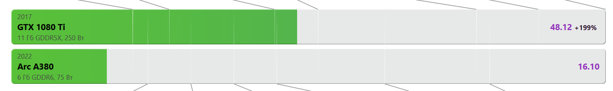 Доброго времени, господа. Вот интересный вопрос: допустим, вы хотите поиграть в игры, но денег на нормальную игровую систему жалко. Вы хотите собрать нечто начально-игровое, и тут встает вопрос - а что делать с видеокартой? Среди бюджетных вариантов можно найти GTX 1650 (15К рублей), RX 6400 (15К), Arc A380 (13К), что звучит как не очень хорошая идея. На барахолке за такие деньги можно найти старые, но все еще бодрые карты, типа GTX 1080Ti. И что, таки имба вариант? Если мы посмотрим на разницу в тестах между той же 1080Ti и Arc A380, то увидим пропасть: А если сравним цену этих видеокарт, то выбор, казалось бы, очевиден: Но тесты - это одно, а вот игры - совсем другое. Для удобства (а еще по причине драйверов), сравнивать 1080Ти будем с GTX 1650 GDDR6 - как некий "собирательный образ" бюджетной видеокарты с нормальными драйверами. Итак, момент истины: В "ассасине" второй свежести, старый топ оказывается чуть больше, чем на половину быстрее, чем бюджетная видеокарта из магазина. В "бат