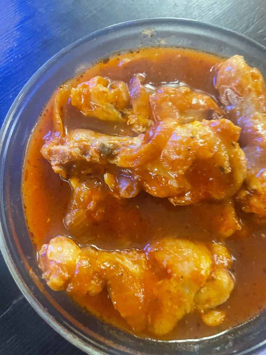В глубокую сковороду масло, когда оно разогрелось - на него крылышки (или что у вас есть) и немного "обжариваем".