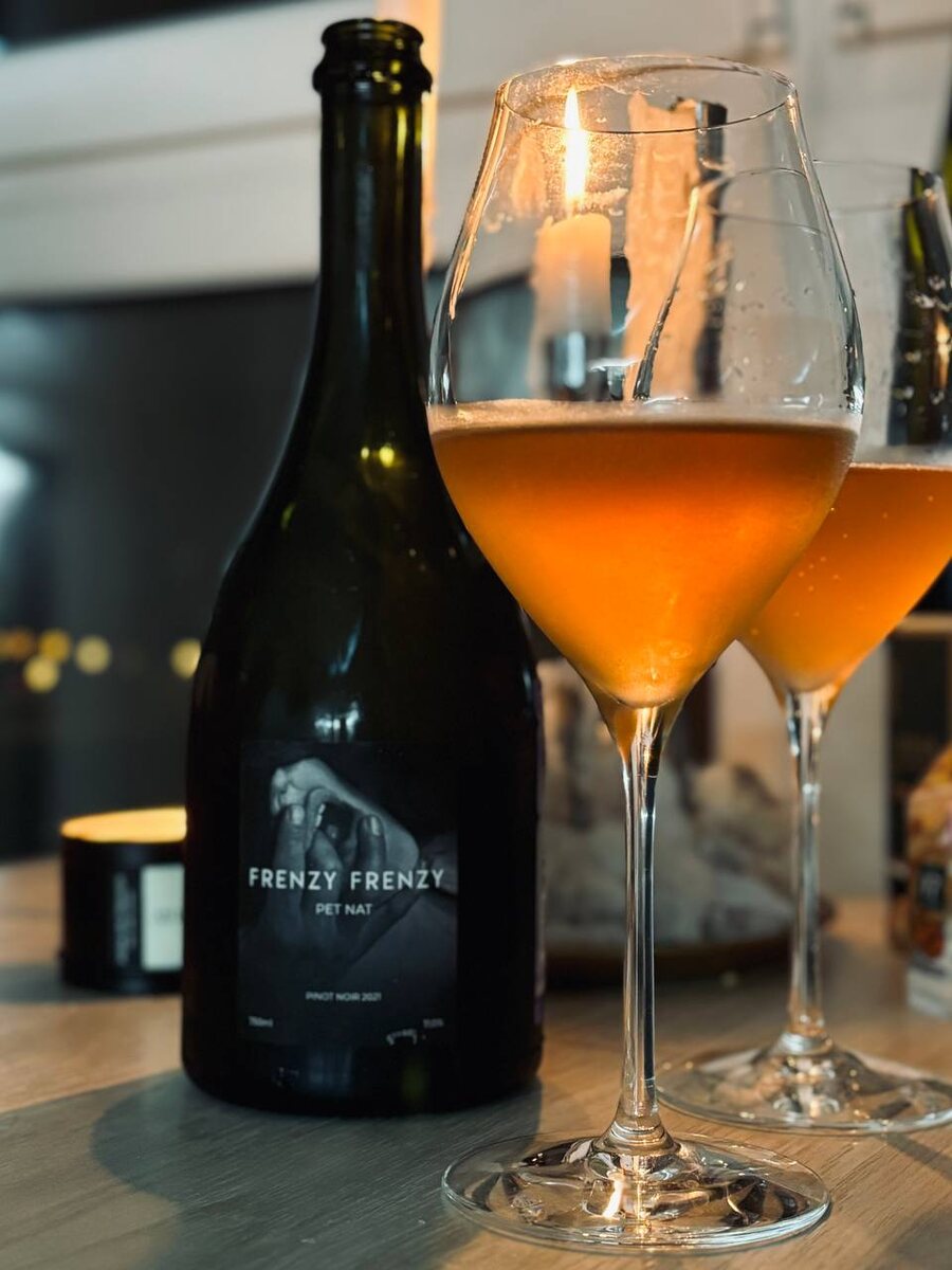 Frenzy Frenzy Pinot Noir 2021 ЗГУ «Кубань Новороссийск» 11% алкоголя Итак, это метабренд вина от компании Involta, и одно из этих вин разливается на «Шато Пино». Возглавляет его Алексей Концов, и пока что представлена только версия из Пино Нуара, но на подходе Шардоне. Вино укупорено кронен пробкой, под которой скрывается пластиковый «бидюль». Это стоит учесть при открытии: кронен пробку я снял, а вот «пластик» празднично стрельнул в потолок) Вино имеет розово-медный мутноватый цвет (как честный пет нат), в свете свечей напоминающий пиво, и действительно, определенные коннотации с этим продуктом тут имеются. Аромат: уваренные и слегка окисленные яблоки, персики и груша. Всё это сдобрено щедрым тоном дрожжей, которые придают вину лёгкий аромат хлебного мякиша и кваса. Во вкусе плотно, достаточно тельно. Кислотность бодрая, но высокой её не назовешь. Опять в силу вступает дрожжевой тон, который вновь напоминает о хлебе и солоде, а фруктовость идентична той, что была в аромате: красные яб