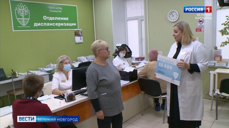 В Великом Новгороде в Центральной городской клинической больнице вручили сертификат тридцатипятитысячной новгородке, которая прошла диспансеризацию в этом году. Всего в Новгородской области на плановый медицинский осмотр пришли более 120-ти тысяч человек. Желающих проверить своё здоровье с каждым годом становиться всё больше. Диспансеризация сегодня проходит за несколько часов и без длинных очередей. Профосмотры поэтапно проводятся и в удалённых районах Новгородской области. Диспансеризация направлена на ранее выявление хронических неинфекционных заболеваний: болезней системы кровообращения, дыхания, онкологии и сахарного диабета. Врачи рекомендуют проходить медицинский осмотр людям до 40 лет раз в три года, лицам старшего возраста обследоваться нужно ежегодно. По результатам осмотра, на основании анализов, или каких-либо иных выраженных изменений в организме, врач ставит пациента на диспансерное наблюдение или даёт иные рекомендации. Новгородка Наталья Петрова проходит профосм