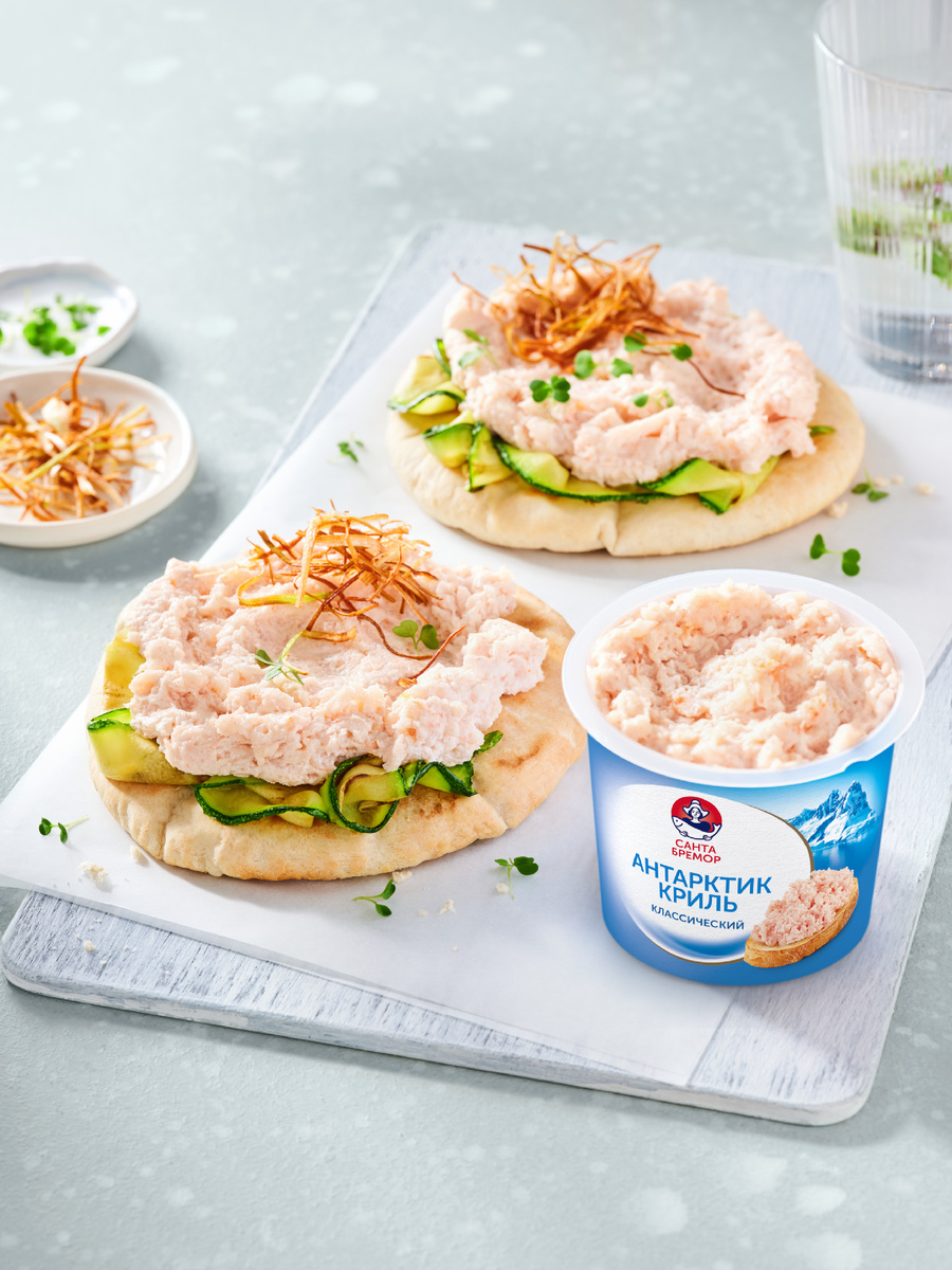 Начнём с лёгкого старта. Представьте: турецкие лепёшки-базламы, хрустящий лук-порей и нежные слайсы цукини, обжаренные в сладковатом соусе терияки. А главный герой этой закуски — паста из криля. Если вы думаете: «Ого, криль? Это что вообще такое и с чем его едят?», то не переживайте. Едят его с удовольствием и большим аппетитом!