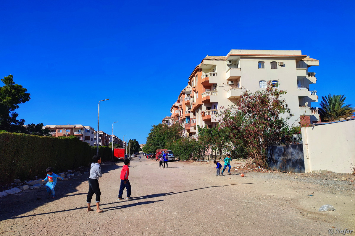 Сегодня речь пойдет о социальном районе Мубарак-5. Слышала версию, что цифра означает год постройки, типа Мубарак-2 построен в 2002 году, Мубарак-5 в 2005-м, Мубарак-8 в 2008-м. На самом деле, это не так. Мубарак-2 построен в конце 1990-х. Покажу, как он выглядит спустя 25 лет. Мубараки названы в честь бывшего президента Египта Хосни Мубарака, это муниципальное жилье, построенное на государственной земле. Мубарак-5 находится поблизости от района Мубарак-2, о котором я уже рассказывала. Между ними расположено несколько домов, которые называют Новым Каусером. Мубарак-5 достаточно крупный район. Застройка широкая, расстояния между домами большие. Зелень тоже присутствует. Местами даже есть асфальт. Архитектура вполне соответствует тенденциям того времени и представлению египтян о прекрасном. Балясины на балконах и вот это вот все. Местные жители вынуждены спасаться от солнца, во многих домах Хургады можно видеть маленькие окна, некоторые из которых даже выходят во внутренний технический д