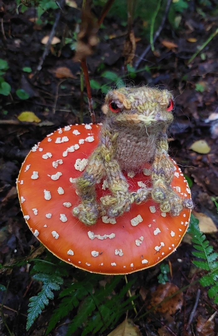 Поняла, что не показывала тут лягушек, которых периодически вяжу. Надо исправляться:) Вот такие лягухи на каркасе периодически получаются. На каркасе, чтобы можно было им гнуть лапы, как хочется. Это вот села в лягушачью позу. Можно посадить на лестницу, можно на кошку: (Извините за заблюренный задник, мой диван линяет от старости, так что не очень фотогеничный.) Ещё лягушку можно нарядить в свитер (жаль, что для этого его тоже нужно связать, но у всего свои недостатки): Всех лягушек я вяжу из пряжи, которую сама покрасила, поэтому они такие пятнистые. Сейчас покажу более зелёный вариант: Ещё заодно покажу лягушку, которую недавно рисовала цветными чернилами на инктобер, чего добру пропадать:) вот она: И вот ещё я для понимания лягушачьих размеров. Всем спасибо за внимание! Пост автора SophieNikk. Читать комментарии на Пикабу.