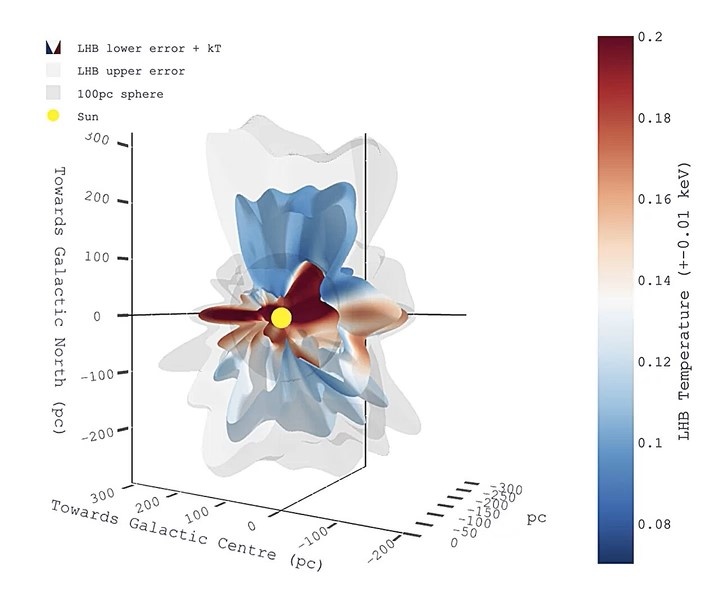 Учёные из Института внеземной физики Макса Планка (MPE) сделали новое открытие: крупномасштабный температурный градиент в Локальном горячем пузыре (LHB), который может быть связан с прошлыми взрывами сверхновых. Это важное открытие стало возможным благодаря данным глобального обзора неба eROSITA All-Sky Survey и представляет собой первый зафиксированный температурный градиент такого масштаба в LHB. Локальный горячий пузырь — это область с крайне низкой плотностью, содержащая горячий газ с температурой в миллионы градусов, который излучает мягкие рентгеновские лучи. Эта область окружает Солнечную систему и давно привлекает внимание астрономов, стремящихся понять её происхождение и эволюцию. Новые исследования показали, что LHB имеет тенденцию распространяться вдоль галактических полюсов, так как горячий газ расширяется в направлении наименьшего сопротивления, отталкиваясь от плотного галактического диска. Используя данные от eROSITA All-Sky Survey, исследователи из MPE разработали уника