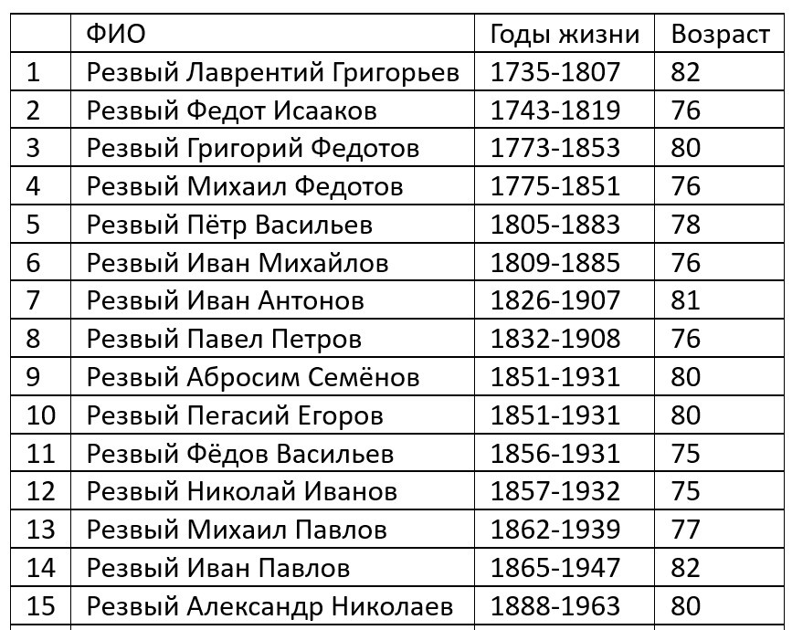 Сколько лет жили наши предки? Долог был их век или короток? Конечно, в тяжелых условиях Севера, при коротком лете и длинной холодной зиме, когда бОльшую часть дня приходилось проводить в душной избе, при достаточно скудном питании - без овощей и фруктов - ожидать большой продолжительности жизни достаточно сложно. Однако до преклонных лет люди доживали. К сожалению, у меня нет статистики по женщинам, так как мне кажется, что женщины жили дольше. А здесь список Резвых из деревни Ивановской, которые перешагнули рубеж в 75 лет: А теперь долгожители села Ивановского: А долго ли жили ваши предки на Верхопаденьгской земле?