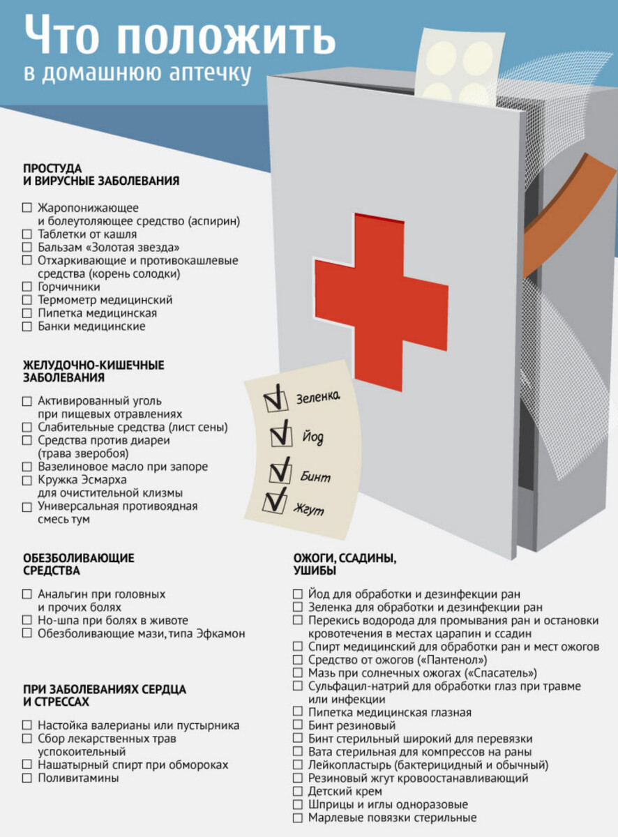 Что должно быть в домашней аптечки: Бинт Перекись водорода/Хлоргексидин Зелёнка Йод Градусник Вата, ватные диски Лейкопластырь Бинт эластичный Ибупрофен/Нурофен(от головной боли) Левомеколь(мазь для лечения инфицированных ран от порезов, ссадин, травм, ожогов) ТераФлю(от гриппа и простуды) Стрепсилс(от боли в горле) Карвалол/валокардин(после стрессовых ситуаций впечатлительным людям/если не можешь уснуть) Бепантен(небольших ран с угрозой инфицирования, таких как ссадины, царапины, небольшие порезы и расчесы, трещины, легкие ожоги) Нимесил гранулы(противовоспалительное, обезболивающее и жаропонижающее) Спазмалгон(обезболивающие) Энторосгель(отравления) Тизин(спрей от насморка) Пантенол(от ожогов)