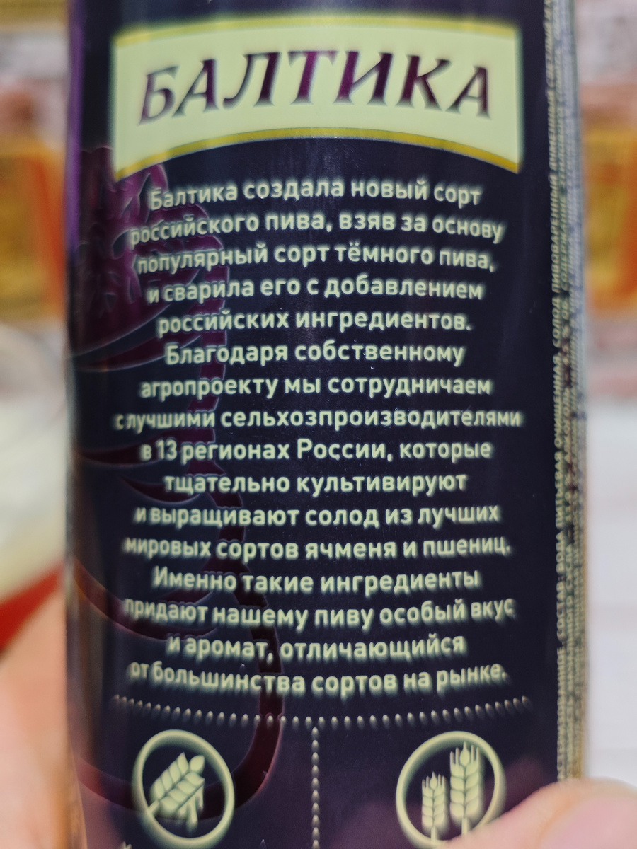Изготовитель: ООО "Пивоваренная компания "Балтика", г. Санкт-Петербург. На сайте пивоварни пишут следующее: Балтика Тёмное – темное пиво в стиле браун эль с насыщенным, полным вкусом с приятной хмелевой горчинкой, обладающее глубоким темно-карамельным цветом. Карамельный солод придает пиву хлебные и карамельные нотки в послевкусии. Охлажденная Балтика Тёмное идеально сочетается с жареной свининой и стейком, а также с белыми зрелыми сырами. Балтика Тёмное сварено из 100% российского солода. Благодаря собственному агропроекту, мы сотрудничаем c российскими сельхозпроизводителями в 13 регионах России, которые тщательно выращивают лучшие мировые сорта ячменя и пшеницы. Именно такие ингредиенты придают нашему пиву особенный вкус и аромат, отличающийся от большинства сортов на рынке. Ещё немного можно прочитать прямо на банке: Прям новый сорт? В России никогда никто не варил ничего подобного? Не сильно разбираюсь, так что спорить не стану и допущу, что так оно и есть. *********************