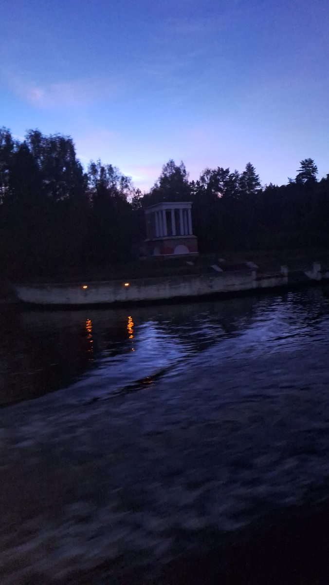 Путешествие продолжается. Поужинали, а солнце уже село и мы уже у вторых заградительных ворот №121, в западной части города Долгопрудного Московской области. А значит, мы уже на соединительном участке канала между Химкинским и Клязьминским водохранилищами. Зажигаются огни... Пока их мало... Но вот огней добавилось - навстречу нам плывет наш собрат - круизный теплоход. Машем руками. Проплыл и темнота становится гуще. В небе огоньки. Их много, это самолёты, ведь рядом аэропорт Шереметьево. Но вот просветлело. Из-за густого леса на берегу канала поднимается полная луна. Добавляют света работающие в пятницу вечером эллинги, затоны с яхтами и катерами. Плывём по Икшинскому водохранилищу. Луна всё выше, света всё больше. Подплываем к шлюзу №6, архитектор оформления шлюза Георгий Густавович Вегман. Интересно: нумерация шлюзов на канале имени Москвы начинается от Волги. По каналу воды Волги текут в Москву-реку. Но принято считать правый берег канала по направлению движения теплоходов от Сев