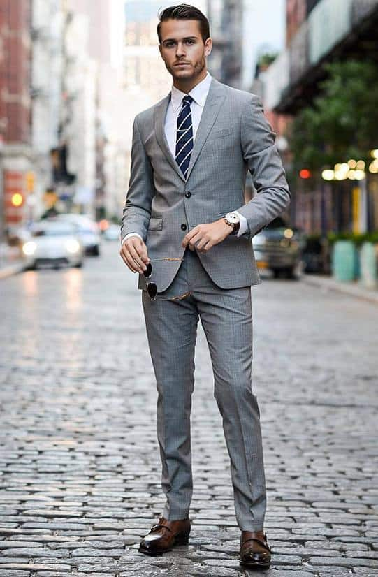 1. Серый выпускной костюм с коричневыми ботинками