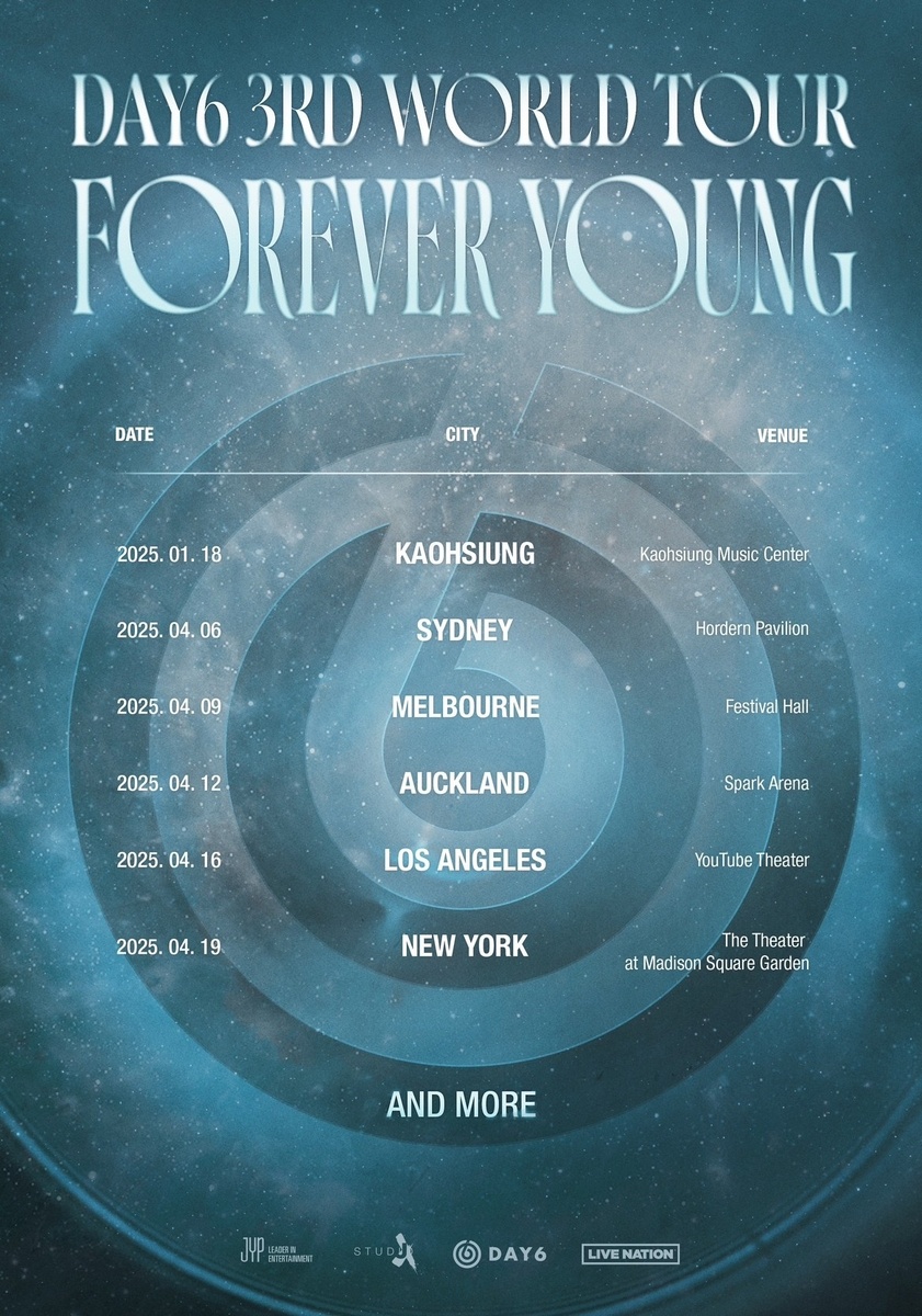 Группа Day6 (데이식스) анонсировала расширение своего третьего мирового тура под названием "포에버 영" (FOREVER YOUNG). 30 сентября 2024 года JYP Entertainment (JYP 엔터테인먼트) опубликовала новый постер, который представляет дополнительные города и даты концертов. Расписание концертов выглядит следующим образом: Таким образом, группа проведет концерты в шести городах, и особое внимание стоит обратить на Окленд, где состоится их первый сольный концерт. Все концерты, прошедшие на данный момент, стали настоящим успехом и были полностью распроданы. Туры начались в Инчхоне, где собралось более 40 тысяч поклонников, после чего группа выступила в таких городах, как Куала-Лумпур, Бали, Сурабая и Джакарта. В планах у группы также концерты в Бангкоке, которые состоятся 30 ноября и 1 декабря, а также в Гонконге с 25 по 26 января 2025 года — и эти билеты уже нашли своих владельцев. Day6 продолжит свой тур в Сингапуре 22 октября. Группа недавно добилась значительных успехов в музыкальных чартах. Их заглавная п