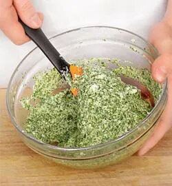 Разогрейте духовку до 160°С. Разделите яйца на белки и желтки. Белки взбейте до мягких пиков. Нарежьте листья шпината и петрушку. В чашу кухонного комбайна положите желтки, муку, щепотку соли, шпинат и петрушку и измельчите. Добавьте белки в зеленую смесь.