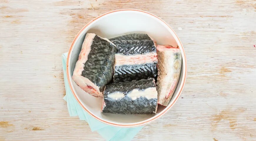 Осетра очистите, разделайте и нарежьте на куски. Желатин замочите в небольшом количестве воды.