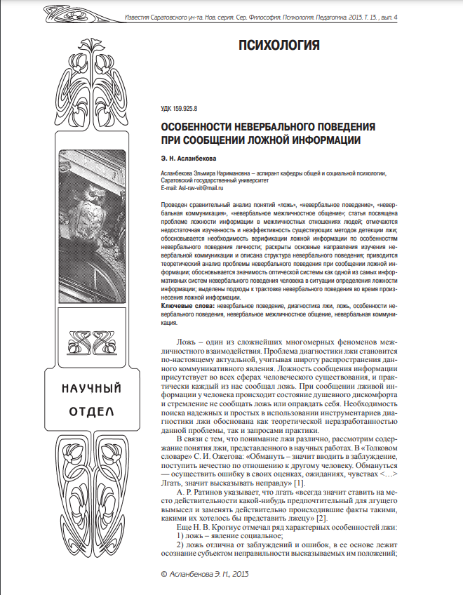ОСОБЕННОСТИ НЕВЕРБАЛЬНОГО ПОВЕДЕНИЯ ПРИ СООБЩЕНИИ ЛОЖНОЙ ИНФОРМАЦИИ