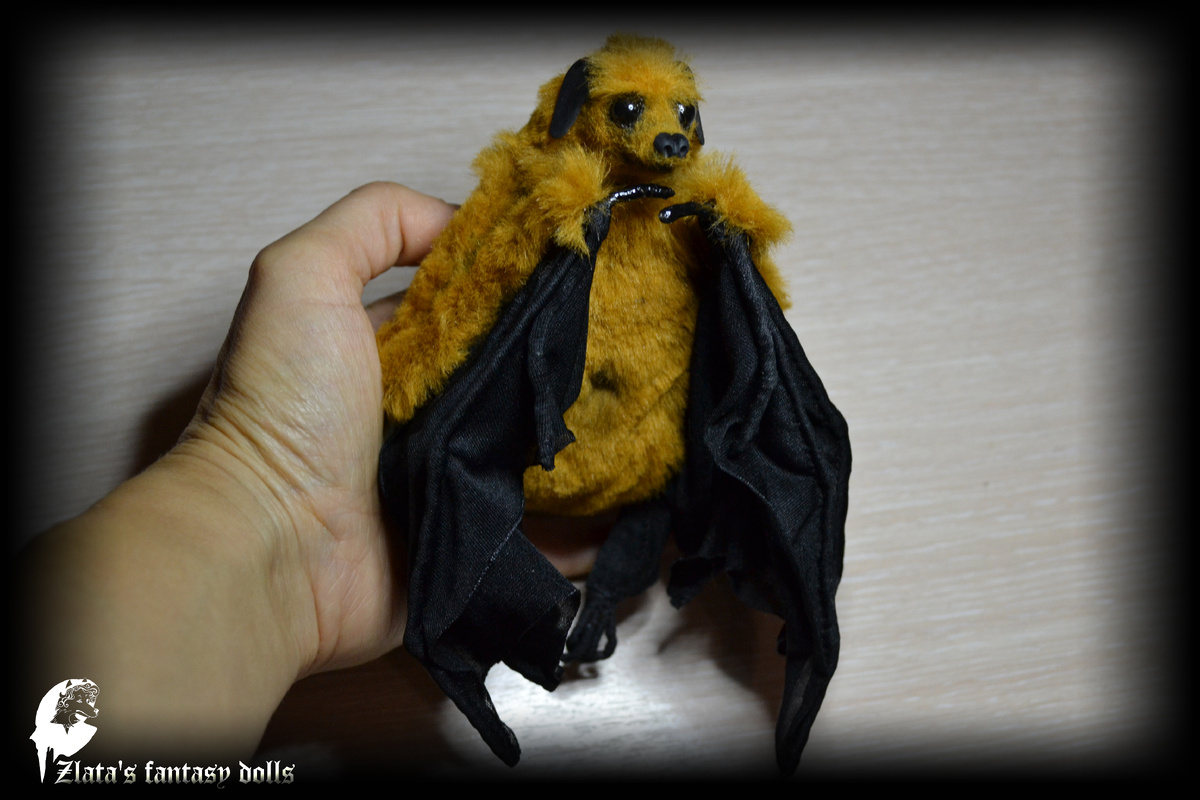 Мир авторских кукол Anthrogon Автор Zlata's fantasy dolls 100% ручная работа в единственном экземпляре. Размер летучки с расправленными крыльями - 35 см , со сложенными - 10 см, рост - примерно 14 см (с мою ладонь). Я создала проволочный каркас внутри тела, обернула его в синтепон и обшила качественным искусственным мехом светло коричневого цвета, придала реалистичность! Голова сделана из фотополимерной смолы - авторская 3д модель. Для крыльев была использована прозрачная эластичная чёрная ткань. Пальчики на лапках гнутся. Это скульптура подвижная. Работа подписана и поставляется с сертификатом подлинности, подписанным художником. Работа готова к отправке! Приобрести! Спасибо за просмотр! #летучая мышь #летучая мышь игрушка #хэллоуин #летучая мышь на хэллоуин