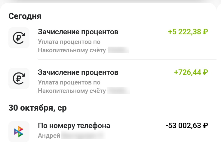 А сегодня я получаю процентные доходы по накопительному счету. Вот два сегодняшних поступления.