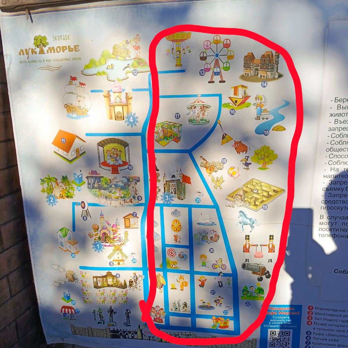 В этой статье продолжим гулять по "Лукоморью", посмотрим на здание музея советского детства, ворона Яшу, увидим Бабу Ягу. Ну что, пойдем дальше смотреть "Лукоморье"? Это будет последняя статья о "Лукоморье". Посмотрим что находится в той части парка, которая на схеме отмечена красным: На первые части прогулки ссылки будут в конце статьи. Первым покажу музей советского детства: Забавная кормушка: Но посмотрим мы только само здание, внутрь заходить не будем. Ступеньки, которые ведут к музею, здесь явно находятся с советских времен. Вход в музей: Внутри маленькое помещение и собрана коллекция предметов того времени. Есть даже игровые автоматы в рабочем состоянии. Автомат уже современный, не с тех времен. Здание музея мы обошли вокруг. Рядом Баба Яга: А это шкафчик для буккроссинга: Книг тут довольно много и они очень разные: Много было учебников. Хоть и было воскресенье, людей в парке достаточно, но на аттракционах катались мало. В этой части парка есть еще один вольер с к