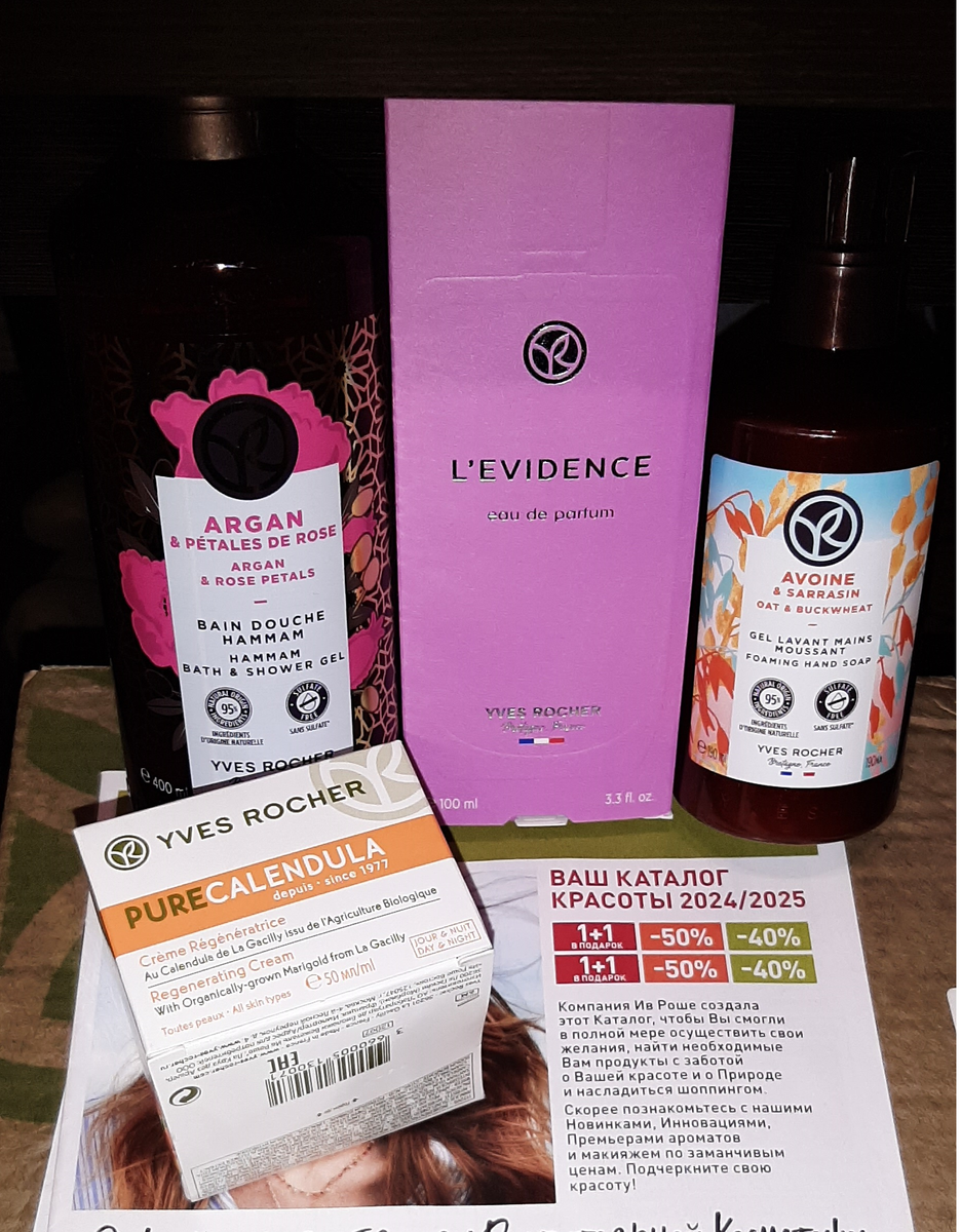 Я- давний поклонник продукции Ив Роше и регулярно делаю заказы через бланки или на сайте компании, стараюсь не упускать возможности приобрести продукцию по выгодным акциям в бутиках. А информацией об акциях я активно делюсь на своем канале. Мои отзывы о продуктах всегда искренние, бренд Ив Роше мне не платит за рекламу, поэтому в каждой моей публикации только моё личное мнение. Всем большой привет! Хочу рассказать о своём заказе, который я сделала по полугодовому бланку заказа 9РИН2АС01. О своих планах сделать заказ по этому бланку я делилась вот тут👇🏻 Заказ у меня получился совсем небольшой, в моих планах было взять в 🎁 подарок парфюм L'Evidence, 100 мл. Я решила пополнить свои запасы гелем для душа "Аргания и роза" 400 мл. и регенерирующим кремом - День & Ночь, 50 мл с Календулой БИО. Это очень хороший и бюджетный крем и я от души рекомендую его попробовать, если не пробовали, тем более, что цена довольно бюджетная. Для крема такого ценового сегмента у него достаточно неплохой
