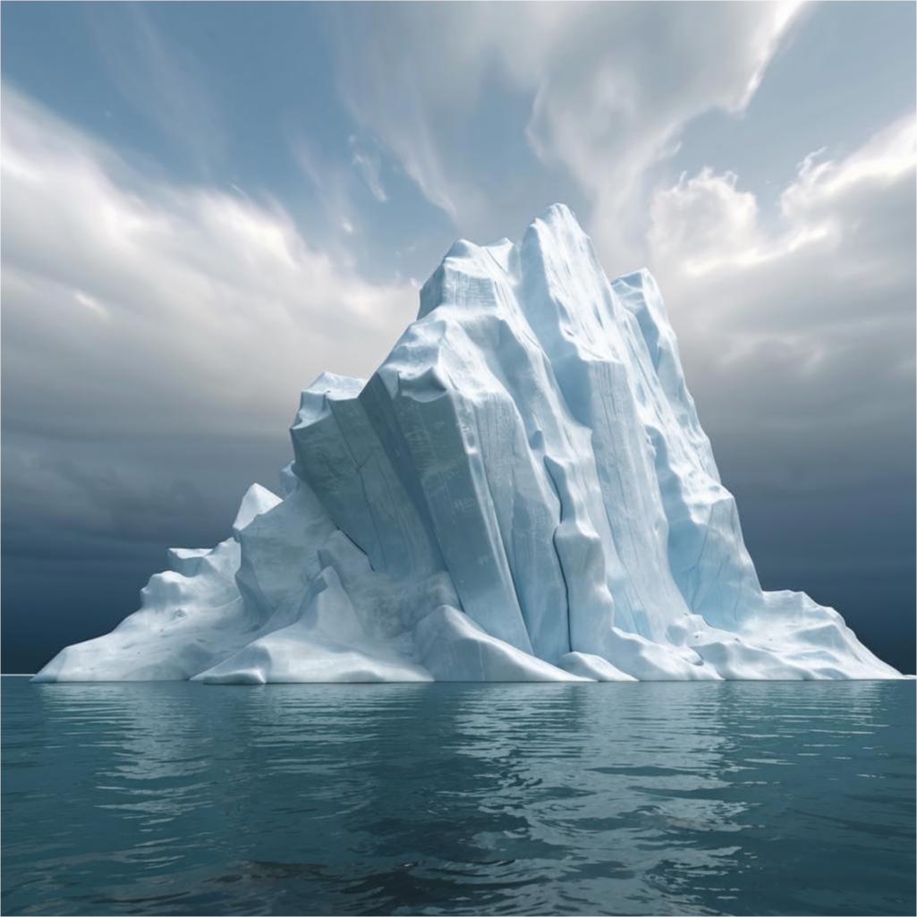 Айсберг — это огромная масса пресного льда, которая откалывается от ледников и дрейфует в океане. Большая часть айсберга находится под водой, и только верхушка, обычно около 10%, видна над поверхностью. Именно поэтому айсберги часто сравнивают с айсбергами знаний — большая часть информации остается "за кадром".