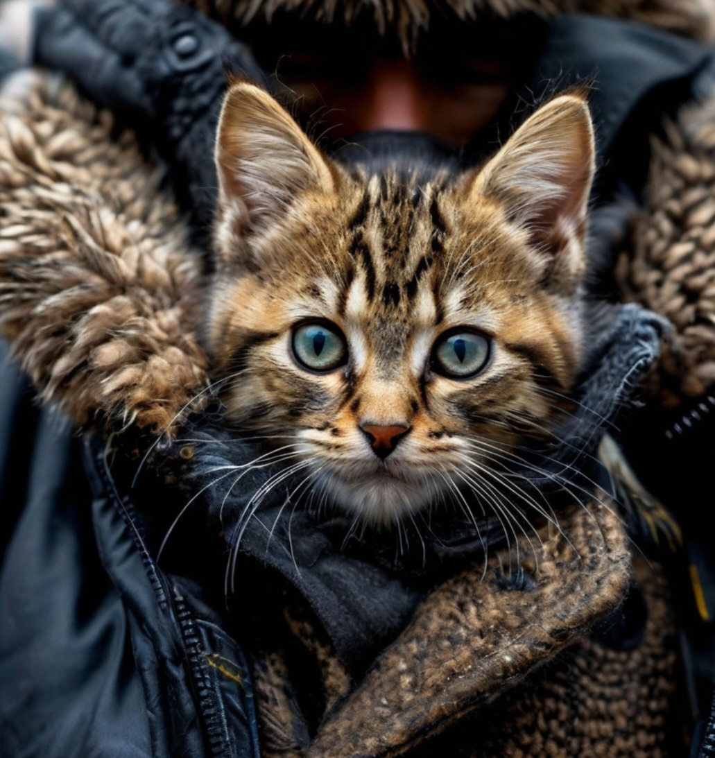 Мужчина достал из-под куртки маленького котёнка. Котёнок был маленький, а мужчина большой, не удивительно, что никто не заметил, как он придерживает куртку. Дети обрадовались.