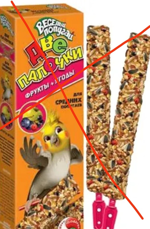 Очень часто в зоомагазинах предлагают лакомства для волнистых попугаев. например, медовые, или зерновые палочки. Эти так называемые лакомства не только не полезны для волнистых попугаев, но очень даже вредны и могут очень пагубно сказаться, на здоровье вашего питомца. Почему вредны? Потому что а таких палочках находятся порченные зерна, а также в составе содержатся сахар, мед, и сырое яйцо. Сахар для попугая - это яд. Мед, который находится в этой вкусной ралочке, может привести птичку к брлезни кандидоз. А сырое яйцо может подарить попугайчику сальмонеллез. В этой палочке содержатся сухие витамины, красители. А еще очень часто в ней можно обнаружить плесень. Всë это может спровоцировать отравление вашего плпугайчика. Вы еще хотите купить такую сладкую палочку?