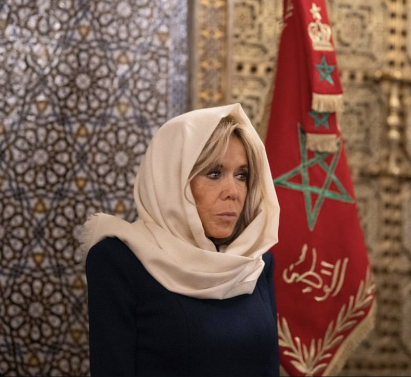 Кстати, туники и хиджаб ей идут. И кажется, она убрала челку? Брижит Макрон в Марокко! Второй день своей государственной поездки первая леди Франции начала с посещения школы в Рабате. Затем она вместе со своим мужем посетила мавзолей Мухаммеда V, где ее сфотографировали в хиджабе и босиком (как того требует традиция), думающей о чем-то ( арабы пишут , что медитировала?!) у могилы покойного короля и подписывающей золотую книгу гостей. День Брижит продолжился посещением Большого театра Рабата и завершился государственным ужином, данным в ее честь и в честь ее мужа Мухаммедом VI во дворце. Бриджит Макрон в туфлях на шпильках и три наряда подряд. Синее платье длиной , закрывающей колено и контрастным широким поясом утром(Louis Vuitton), белое платье с подходящим длинным жакетом днем и элегантное длинное платье с поясом, украшенное кристаллами с шикарной накидкой вечером. Праздничный наряд она подчеркнула, собрав волосы в пучок.